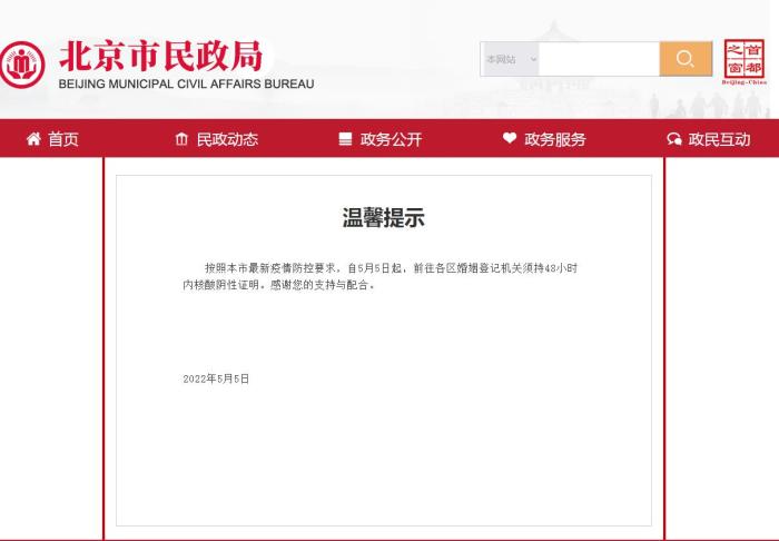 中新網(wǎng)5月6日電 據(jù)北京市民政局網(wǎng)站消息,按照北京市最新疫情防控要求,自5月5日起,前往各區(qū)婚姻登記機關須持48小時內核酸陰性證明。