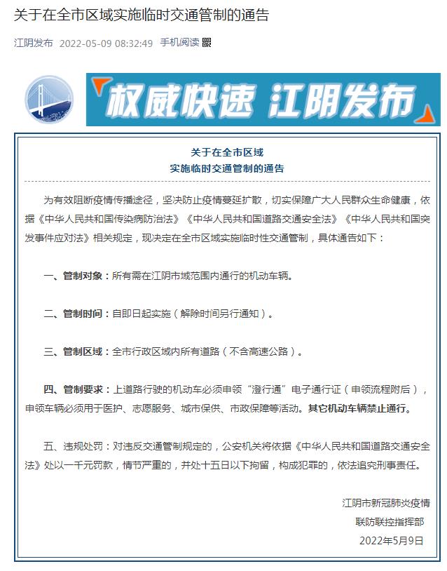 中新網(wǎng)5月9日電 據(jù)“江陰發(fā)布”微信公眾號消息,江蘇省江陰市新冠肺炎疫情聯(lián)防聯(lián)控指揮部9日發(fā)布關(guān)于在全市區(qū)域?qū)嵤┡R時交通管制的通告。通告稱,為有效阻斷疫情傳播途徑,堅決防止疫情蔓延擴散,切實保障廣大人民群眾生命健康,依據(jù)《中華人民共和國傳染病防治法》《中華人民共和國道路交通安全法》《中華人民共和國突發(fā)事件應(yīng)對法》相關(guān)規(guī)定,現(xiàn)決定在全市區(qū)域?qū)嵤┡R時性交通管制。