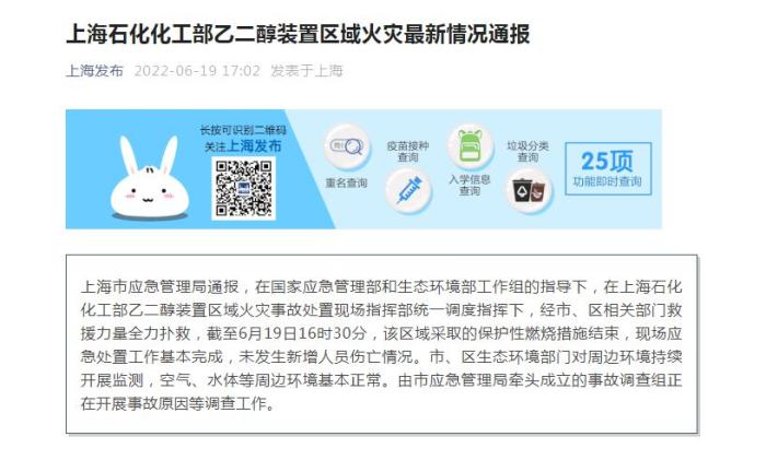 上海石化保護性燃燒措施結束 未發(fā)生新增人員傷亡情況