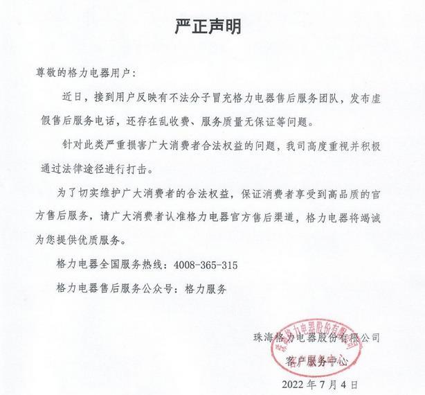 格力電器:有不法分子冒充售后服務團隊 存在亂收費等問題