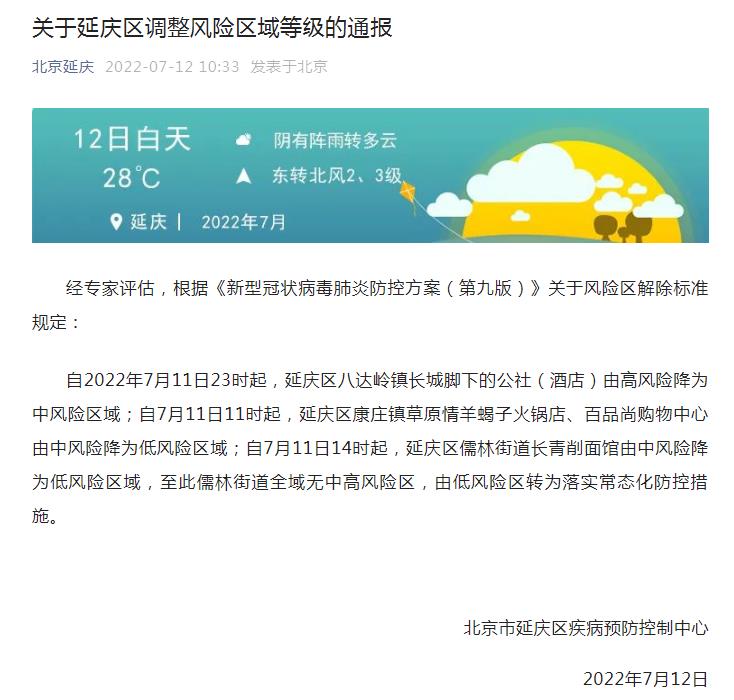 中新網(wǎng)7月12日電 據(jù)“北京延慶”微信公眾號消息,北京市延慶區(qū)疾病預(yù)防控制中心12日發(fā)布通報(bào)稱,經(jīng)專家評估,根據(jù)《新型冠狀病毒肺炎防控方案(第九版)》關(guān)于風(fēng)險(xiǎn)區(qū)解除標(biāo)準(zhǔn)規(guī)定:自2022年7月11日23時(shí)起,延慶區(qū)八達(dá)嶺鎮(zhèn)長城腳下的公社(酒店)由高風(fēng)險(xiǎn)降為中風(fēng)險(xiǎn)區(qū)域;自7月11日11時(shí)起,延慶區(qū)康莊鎮(zhèn)草原情羊蝎子火鍋店、百品尚購物中心由中風(fēng)險(xiǎn)降為低風(fēng)險(xiǎn)區(qū)域;自7月11日14時(shí)起,延慶區(qū)儒林街道長青削面館由中風(fēng)險(xiǎn)降為低風(fēng)險(xiǎn)區(qū)域,至此儒林街道全域無中高風(fēng)險(xiǎn)區(qū),由低風(fēng)險(xiǎn)區(qū)轉(zhuǎn)為落實(shí)常態(tài)化防控措施。