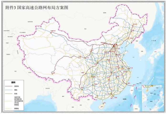 國(guó)家高速公路網(wǎng)由7條首都放射線、11條北南縱線、18條東西橫線,以及6條地區(qū)環(huán)線、12條都市圈環(huán)線、30條城市繞城環(huán)線、31條并行線、163條聯(lián)絡(luò)線組成。其中,首都放射線包括:北京—哈爾濱、北京—上海、北京—臺(tái)北、北京—港澳、北京—昆明、北京—拉薩、北京—烏魯木齊。(中新財(cái)經(jīng))