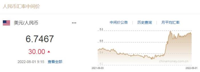 8月1日人民幣對美元中間價報6.7467元 下調(diào)30個基點