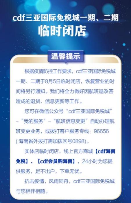 中新網8月5日電 cdf三亞國際免稅城官方微信公眾號消息,根據疫情防控要求,三亞國際免稅城一期、二期8月5日起臨時閉店,恢復營業(yè)時間將另行通知,并將做好因航班退改簽造成的退貨、信息更新等工作。(中新財經)