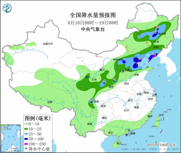 8月18日08時(shí)至19日08時(shí),內(nèi)蒙古中東部、黑龍江西南部、吉林西部、遼寧、青海南部、甘肅東部、寧夏、京津冀、山東北部、四川盆地西南部等地部分地區(qū)有中到大雨,其中,黑龍江西南部、吉林西部、遼寧東部和南部、山西北部、河北中北部、北京、天津等地部分地區(qū)有暴雨或大暴雨(100~180毫米)。內(nèi)蒙古中部和西北部、黑龍江西南部等地部分地區(qū)有4~6級(jí)風(fēng)。渤海、黃海北部海域?qū)⒂?~5級(jí)、陣風(fēng)6級(jí)增大到7~8級(jí)、陣風(fēng)9級(jí)的偏南風(fēng)。