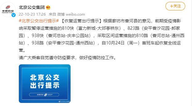 中新網(wǎng)10月23日電 北京公交集團(tuán)23日發(fā)布恢復(fù)運(yùn)營(yíng)出行提示稱(chēng),根據(jù)廊坊市香河縣的意見(jiàn),前期受疫情影響采取暫停運(yùn)營(yíng)措施的810快(富力新城-大郊亭橋東)、823路(安平香汐花園-郎家園)、938快(香河總站-慶豐公園站),采取區(qū)間運(yùn)營(yíng)措施的810路(香河總站-通州西站)、938路(安平香汐花園-通州西站),自10月24日(周一)首班車(chē)起恢復(fù)全線(xiàn)運(yùn)營(yíng)。(中新財(cái)經(jīng))
