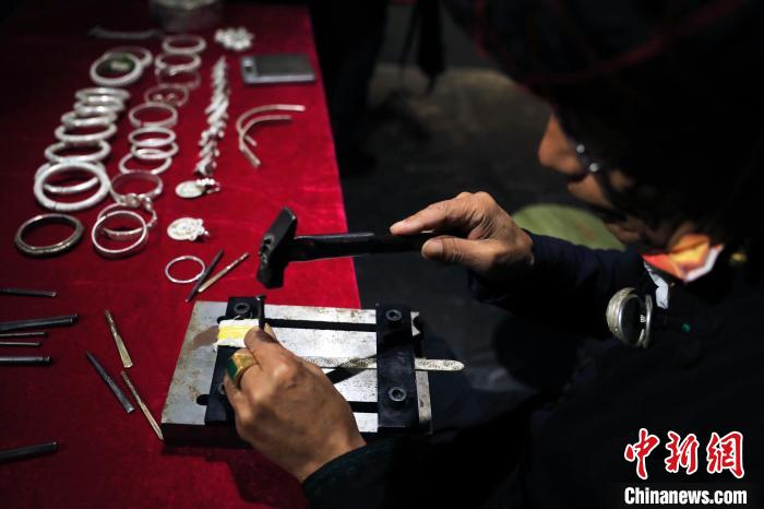 彝族銀飾制作技藝國家級非遺傳承人勒古沙日正在打制銀器?!⊥趵?攝