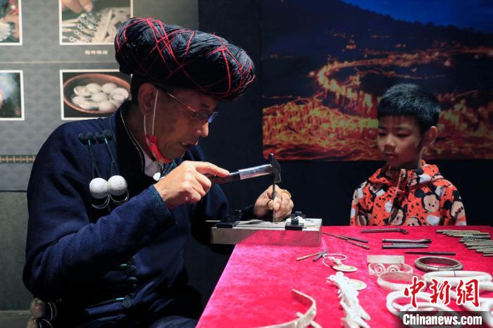 中新網涼山11月7日電 (王利文)“叮咚,叮咚……”6日,清脆的敲打聲從四川涼山民族體育場傳出,在“家園遺珍·時代新風”非遺展演活動中,彝族銀飾制作技藝國家級非遺傳承人勒古沙日正在打制銀器。鷹爪銀杯、鳳冠、胸牌……現場一件件閃亮精致的銀器均出自這位66歲老人之手。