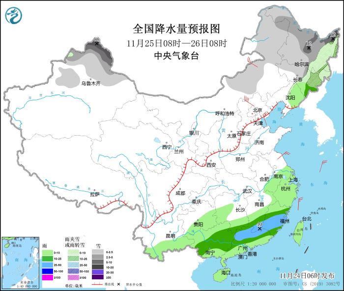 圖1 全國降水量預報圖(11月24日08時-25日08時)