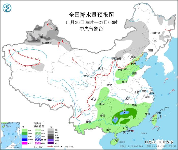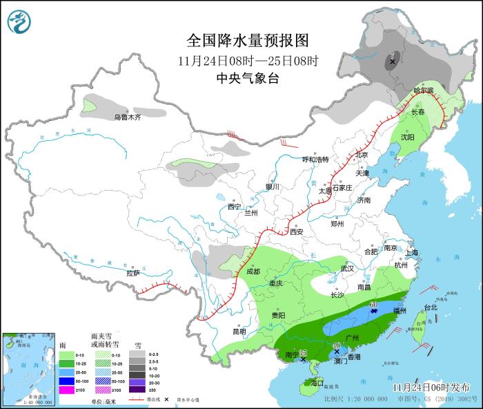 11月24日08時至25日08時,內蒙古東部、東北地區(qū)、新疆沿天山地區(qū)、甘肅河西、川西高原等地部分地區(qū)有小到中雪或雨夾雪,其中,內蒙古東北部局地有大雪(5~7毫米)。江南南部、華南大部等地部分地區(qū)有中到大雨,局地暴雨(50~60毫米)。內蒙古西部部分地區(qū)有5~7級風(見圖1)。