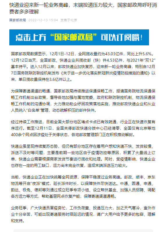 中新網(wǎng)12月13日電 據(jù)“國家郵政局”公眾號(hào)13日消息,當(dāng)前,快遞企業(yè)正在加快統(tǒng)籌全網(wǎng)資源,保障平穩(wěn)渡過業(yè)務(wù)高峰。郵政、順豐、京東物流等開啟“夜派”模式,延長派件時(shí)長,以保障快件盡快送達(dá)。中通、圓通、申通、韻達(dá)、極兔、德邦等則通過成立旺季專項(xiàng)小組、設(shè)立幫扶基金、加強(qiáng)人員招聘、調(diào)配各方運(yùn)力等方式,幫助基層網(wǎng)點(diǎn)恢復(fù)產(chǎn)能,保障寄遞渠道通暢。(中新財(cái)經(jīng))