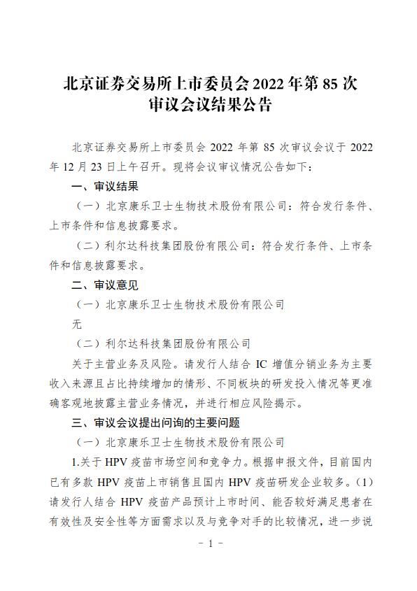 中新網(wǎng)12月26日電 北京證券交易所網(wǎng)站消息,北京證券交易所上市委員會(huì)2022年第85次審議會(huì)議于2022年12月23日上午召開。審議結(jié)果顯示,北京康樂(lè)衛(wèi)士生物技術(shù)股份有限公司、利爾達(dá)科技集團(tuán)股份有限公司符合發(fā)行條件、上市條件和信息披露要求。