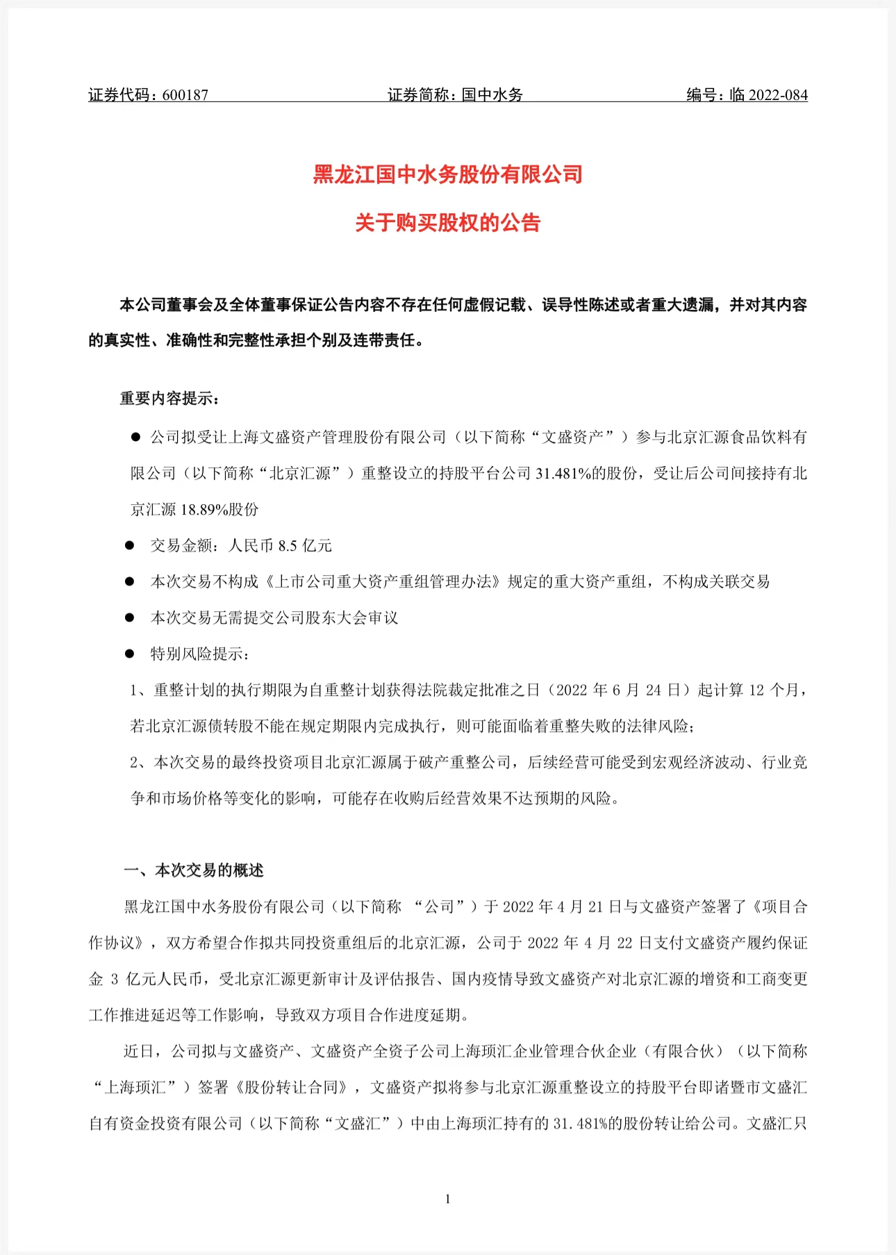 中新網(wǎng)12月28日電 國中水務12月27日發(fā)布公告,擬受讓上海文盛資產(chǎn)管理股份有限公司(以下簡稱“文盛資產(chǎn)”)參與北京匯源食品飲料有限公司(以下簡稱“北京匯源”)重整設立的持股平臺公司31.481%的股份,受讓后公司間接持有北京匯源18.89%股份,交易金額為人民幣8.5億元。