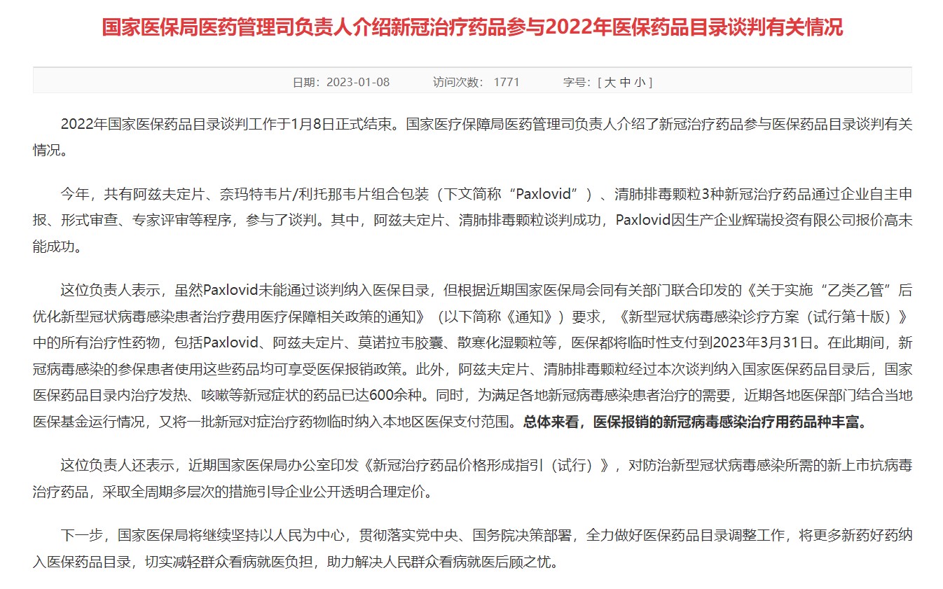其中,阿茲夫定片、清肺排毒顆粒談判成功,Paxlovid因生產(chǎn)企業(yè)輝瑞投資有限公司報(bào)價(jià)高未能成功。