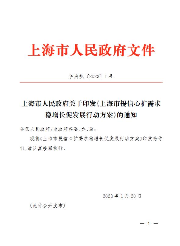 中新網(wǎng)1月29日電 據(jù)上海發(fā)布微信公眾號29日消息,為全面貫徹黨的二十大和中央經(jīng)濟(jì)工作會議精神,落實(shí)市第十二次黨代會和十二屆市委二次全會部署,抓牢高質(zhì)量發(fā)展首要任務(wù),大力提振市場預(yù)期和信心,推動經(jīng)濟(jì)社會發(fā)展開好局起好步,近期上海市制定了《上海市提信心擴(kuò)需求穩(wěn)增長促發(fā)展行動方案》(以下簡稱《行動方案》)。