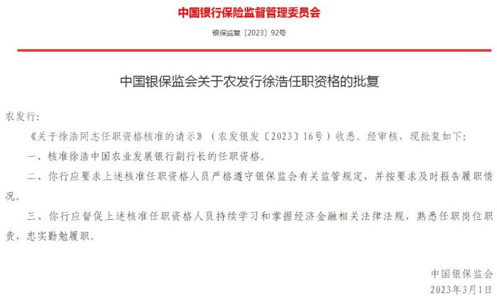 中國銀保監(jiān)會6日公布的《中國銀保監(jiān)會關于農(nóng)發(fā)行徐浩任職資格的批復》顯示,核準徐浩中國農(nóng)業(yè)發(fā)展銀行副行長的任職資格。(中新財經(jīng))