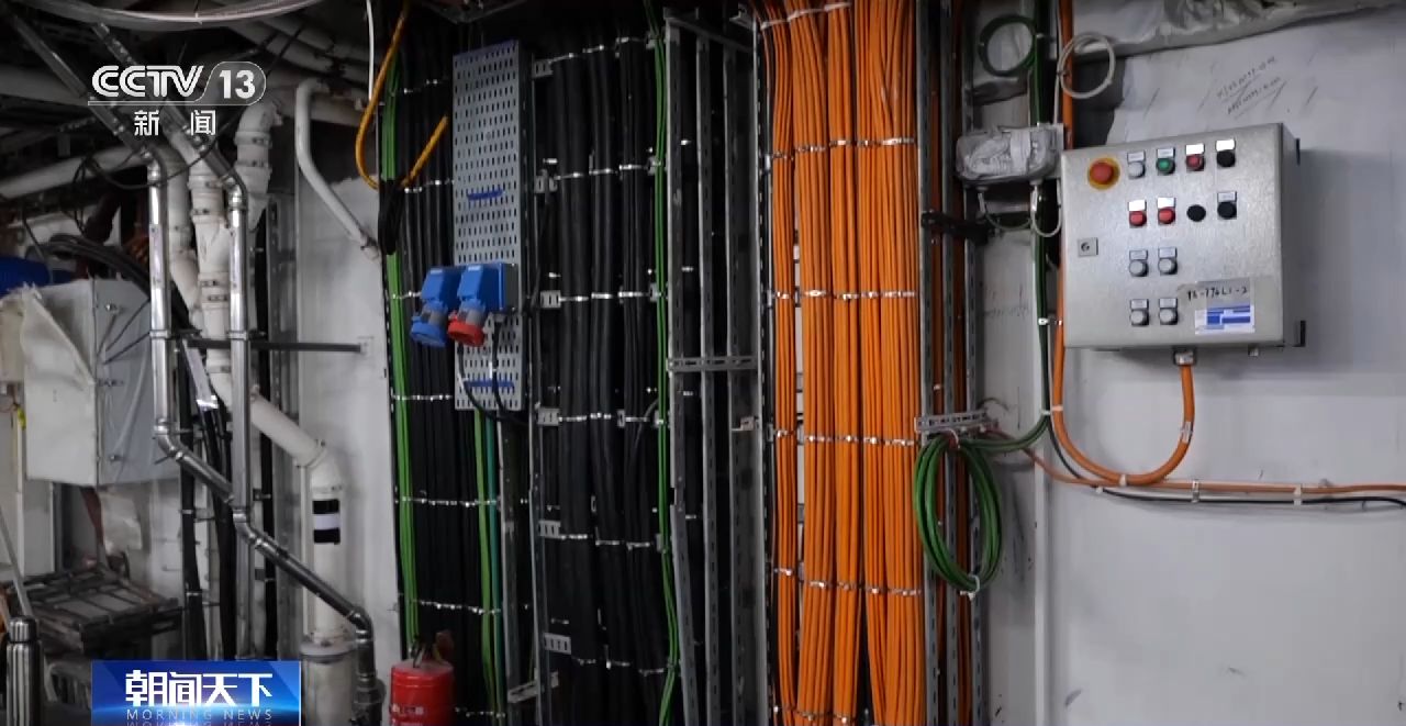 總臺(tái)央視記者 李寧:如何確保這樣一艘海上巨無(wú)霸的正常運(yùn)行,靠的就是我身后的這些電纜,這些電纜就好比這艘船上的神經(jīng)和血管,它的總長(zhǎng)度超過(guò)4300公里,比哈爾濱到三亞的距離還要遠(yuǎn)。