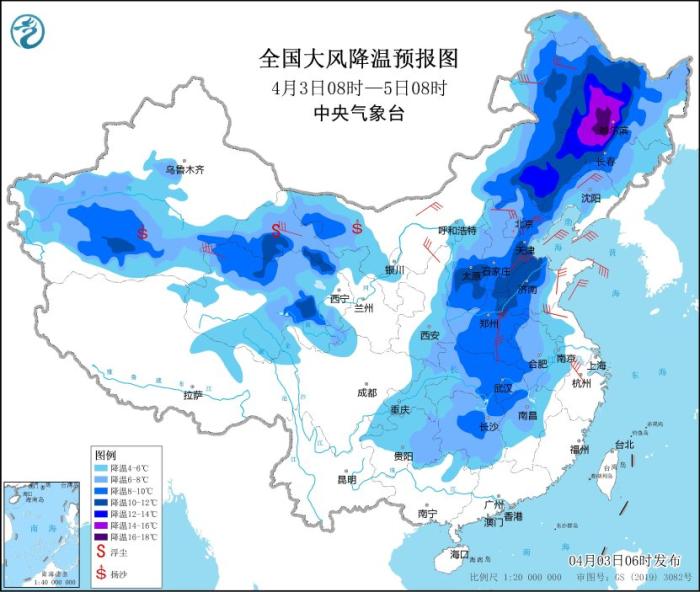 受較強(qiáng)冷空氣影響,4月3日08時(shí)至5日08時(shí),新疆南疆盆地、西北地區(qū)中部、內(nèi)蒙古西部和東北部、華北、東北地區(qū)、黃淮、江漢、江淮中西部、江南中西部等地氣溫將下降4~8℃,其中,內(nèi)蒙東北部、東北地區(qū)西部、華北南部等地局地降溫幅度可達(dá)10℃以上;上述部分地區(qū)并有5~6級(jí)偏北風(fēng),陣風(fēng)7~9級(jí)。新疆南部和東部、內(nèi)蒙古西部、甘肅西部等地有沙塵天氣(見(jiàn)圖1)。3日夜間,渤海、黃海西南部海域、東海西北部海域、長(zhǎng)江口附近海域?qū)⒂?級(jí)、陣風(fēng)9級(jí)的大風(fēng),其中渤海灣將有9級(jí)、陣風(fēng)10級(jí)的大風(fēng)。中央氣象臺(tái)4月3日06時(shí)繼續(xù)發(fā)布大風(fēng)降溫預(yù)報(bào)和海上大風(fēng)黃色預(yù)警。