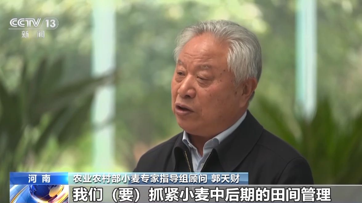 農(nóng)業(yè)農(nóng)村部小麥專家指導組顧問 郭天財:我們要抓緊小麥中后期的田間管理,一個措施一個措施地把它落實落地,一個環(huán)節(jié)一個環(huán)節(jié),我們把它抓緊抓好,來鞏固和發(fā)展當前苗情持續(xù)向好的態(tài)勢,今年小麥豐收還是很有希望的。