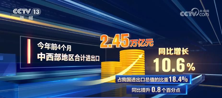 央視網(wǎng)消息:從我國外貿(mào)區(qū)域結(jié)構(gòu)來看,今年前4個(gè)月,中西部地區(qū)合計(jì)進(jìn)出口2.45萬億元,同比增長10.6%,占我國進(jìn)出口總值的比重18.4%,同比提升0.8個(gè)百分點(diǎn)。我國中西部地區(qū)進(jìn)出口快速增長,增速高出全國4.8個(gè)百分點(diǎn)。