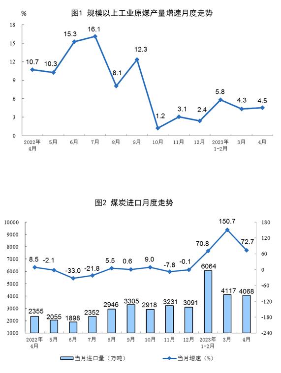 原煤、原油和天然氣生產(chǎn)及相關(guān)情況。原煤生產(chǎn)穩(wěn)步增長,進(jìn)口持續(xù)大幅增加。4月份,生產(chǎn)原煤3.8億噸,同比增長4.5%,增速比3月份加快0.2個(gè)百分點(diǎn),日均產(chǎn)量1272萬噸。進(jìn)口煤炭4068萬噸,同比增長72.7%,增速比3月份回落78.0個(gè)百分點(diǎn)。
