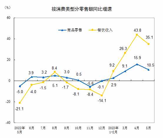 按消費(fèi)類型分,5月份,商品零售33733億元,同比增長10.5%;餐飲收入4070億元,增長35.1%。1—5月份,商品零售167678億元,同比增長7.9%;餐飲收入19958億元,增長22.6%。