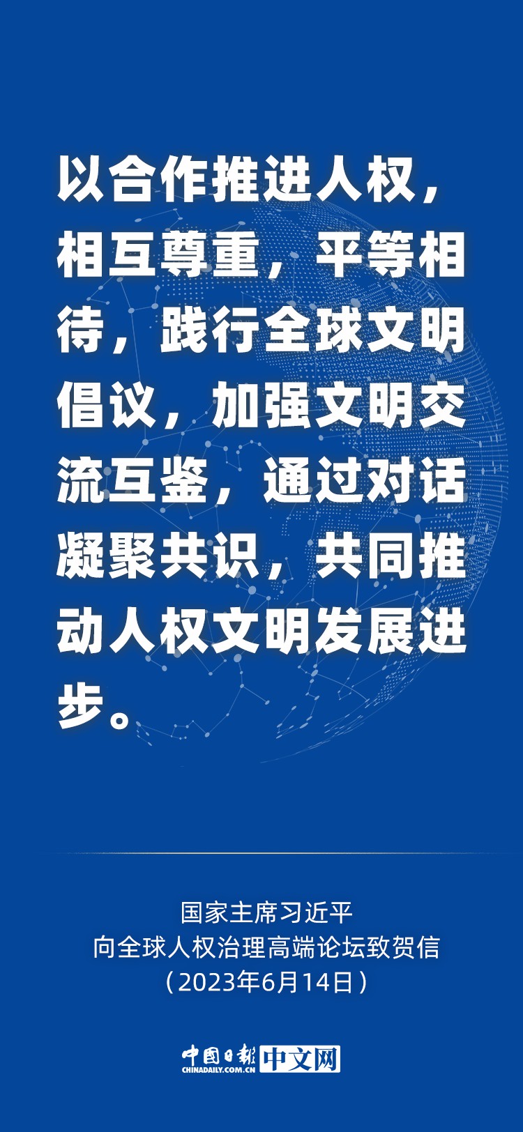 6月14日,國家主席習近平向全球人權(quán)治理高端論壇致賀信。習近平指出,當前,人類又一次站在歷史的十字路口,全球人權(quán)治理面臨嚴峻挑戰(zhàn)。我們主張: