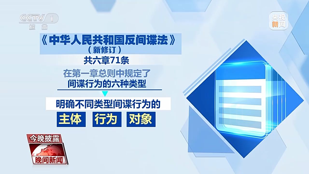 國家安全是安邦定國的重要基石。近年來,我國面臨的安全威脅日趨多元,反間諜斗爭形勢也更加嚴峻復雜。從本月起,新修訂的《反間諜法》開始施行。新法對間諜行為,做出進一步充實和細化。那么按照新法,哪些行為將被認定為間諜行為?作為普通群眾,一旦發(fā)現(xiàn)間諜行為,又該如何處理呢?今晚披露,一塊來關(guān)注。
