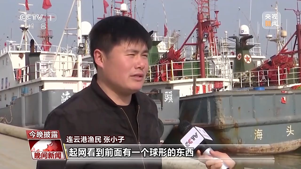 連云港漁民 張小子:起網(wǎng)看到前面有一個球形的東西,也不知道什么,就撈上來一看,上面還有外國字。講座說撿到有外國可疑的裝置,可以上交,我們船上有衛(wèi)星電話,打電話聯(lián)系,國家還給了獎勵。