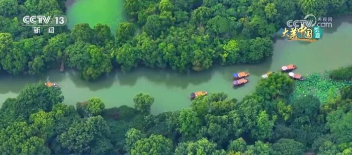 這里是杭州西溪國家濕地公園。盛夏時節(jié),杭州西溪濕地草木蔥蘢、綠樹成蔭,鷺舞燕翔、荷香魚躍,星羅棋布的魚塘呈現(xiàn)出“萬塘攬勝”的美景。這里生態(tài)資源豐富,有維管束植物739種、鳥類203種、昆蟲911種、魚類56種。二十年來,杭州西溪濕地以保護原生態(tài)為目標,統(tǒng)籌生產、生活、生態(tài)三大空間布局,探索了一條濕地保護與利用雙贏的道路。