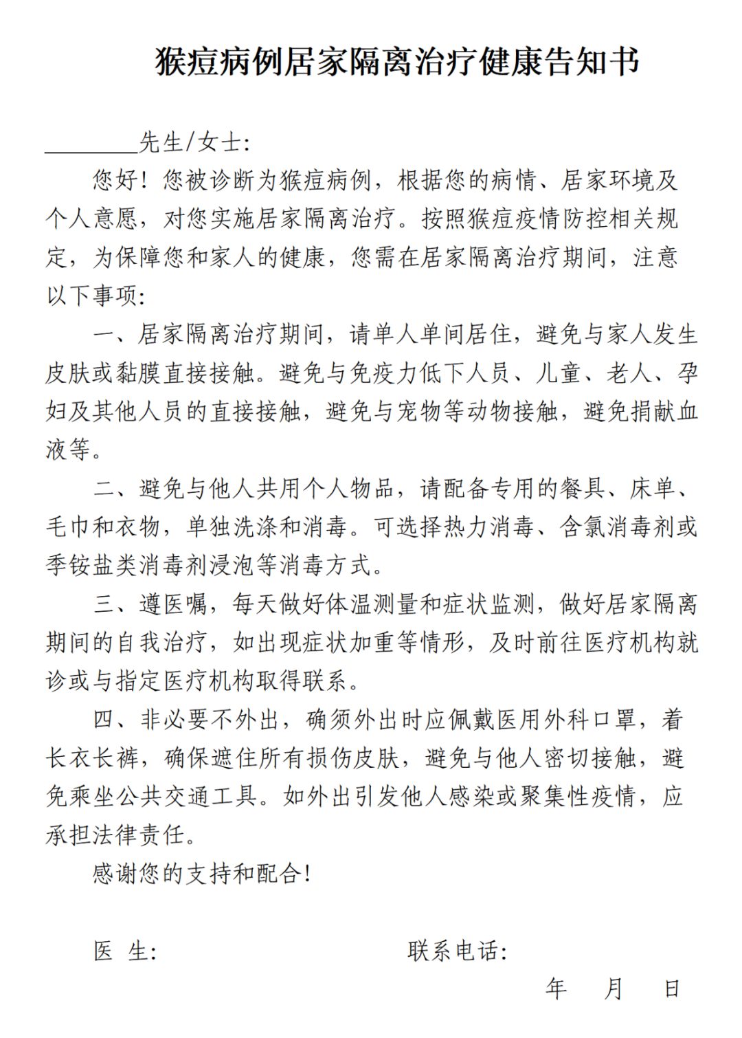 各地發(fā)現猴痘疑似病例和確診病例應當及時轉運至醫(yī)療機構進行隔離治療,如臨床癥狀明顯好轉,病變部位已結痂,可轉為居家隔離治療,直至皮疹結痂自然脫落,解除居家隔離。對病情較輕且具備居家隔離治療條件的確診病例,經醫(yī)療機構與疾控機構聯合評估后,可直接采取居家隔離治療。對于實行居家隔離治療的確診病例發(fā)放《猴痘病例居家隔離治療健康告知書》(見附件2)。確診病例居家隔離治療期間,單人單間居住,避免與家人有皮膚或黏膜直接接觸,做好被污染物品的消毒,非必要不外出,確須外出時穿長衣長褲、佩戴醫(yī)用外科口罩,避免前往人群聚集場所,避免與其他人有皮膚或黏膜直接接觸;指定醫(yī)療機構安排專人負責上門或電話隨訪,提供健康咨詢和醫(yī)療指導。