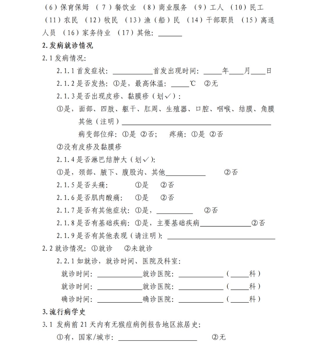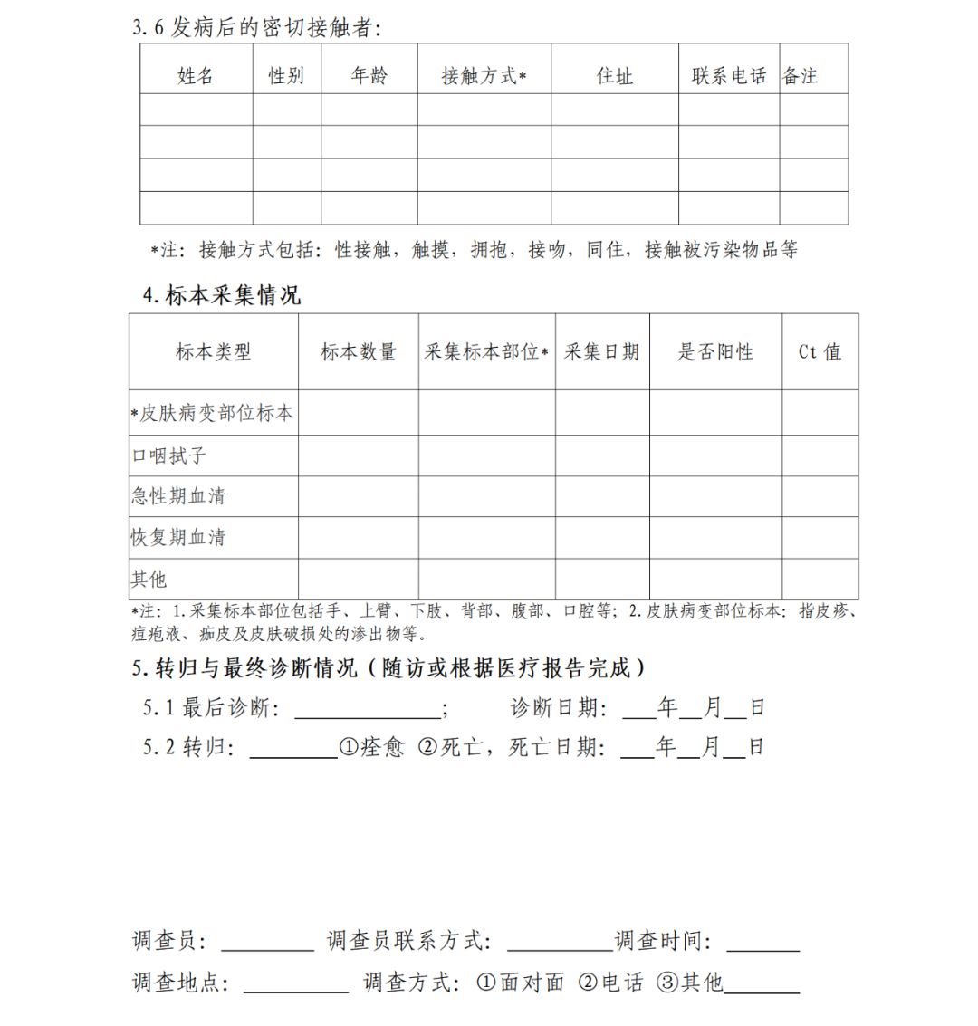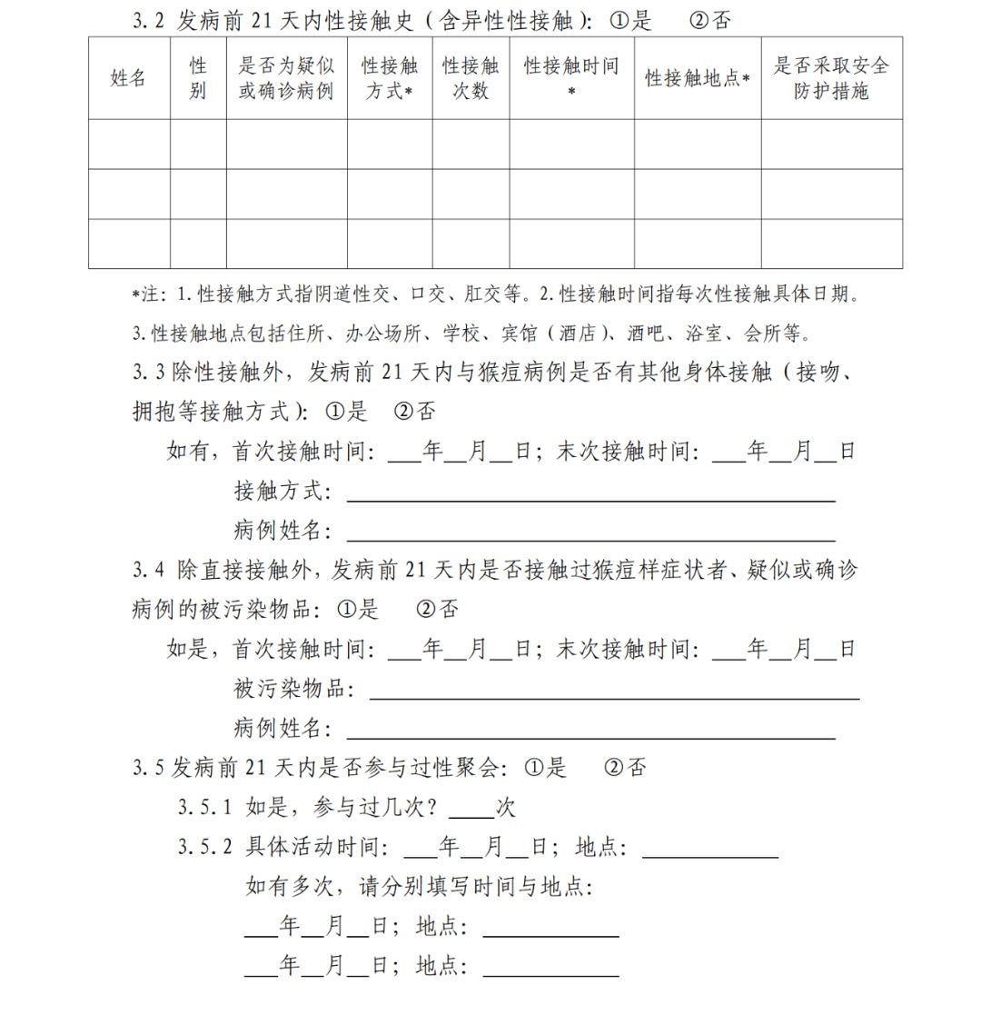 開展個案調查時,要認真、詳細了解和記錄病例基本信息、發(fā)病就診情況、臨床表現、轉歸及實驗室檢測信息;發(fā)病前21天內與可疑感染來源的接觸史、接觸場所及接觸方式;發(fā)病后至隔離治療前的具體活動地點、與其有皮膚或黏膜直接接觸者,以及發(fā)病前4天內與其有性接觸者。