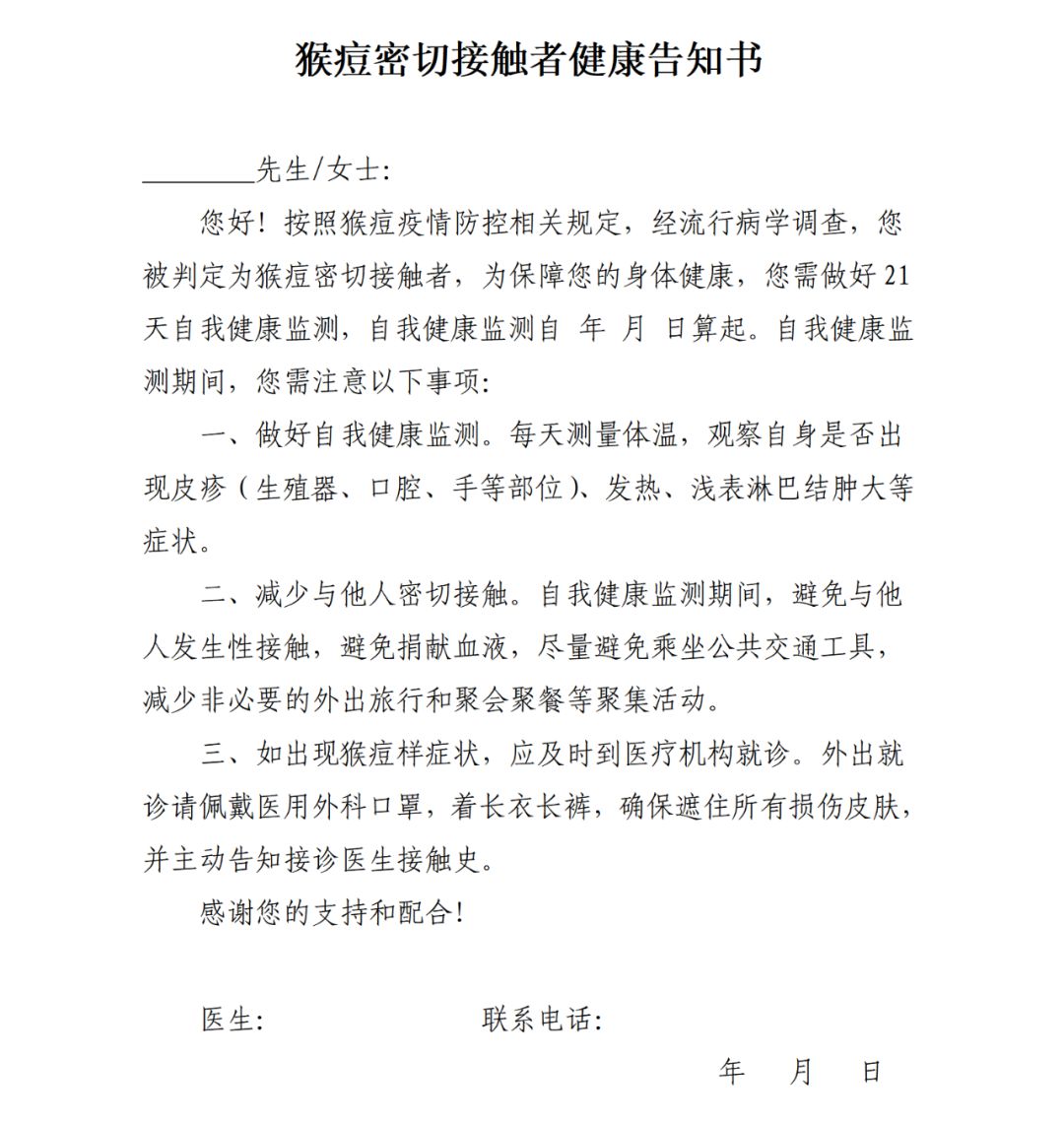 密切接觸者自我健康監(jiān)測期間可正常生活與工作,需避免與他人發(fā)生性接觸等密切接觸,避免捐獻血液等;堅持每天做好體溫測量和癥狀監(jiān)測,出現猴痘樣癥狀應及時就診并主動報告可疑接觸史。轄區(qū)疾控機構或基層醫(yī)療衛(wèi)生機構應在密切接觸者自我健康監(jiān)測第7、14、21天上門或電話對其進行隨訪,提供咨詢指導,發(fā)現異常情況及時進行處置。