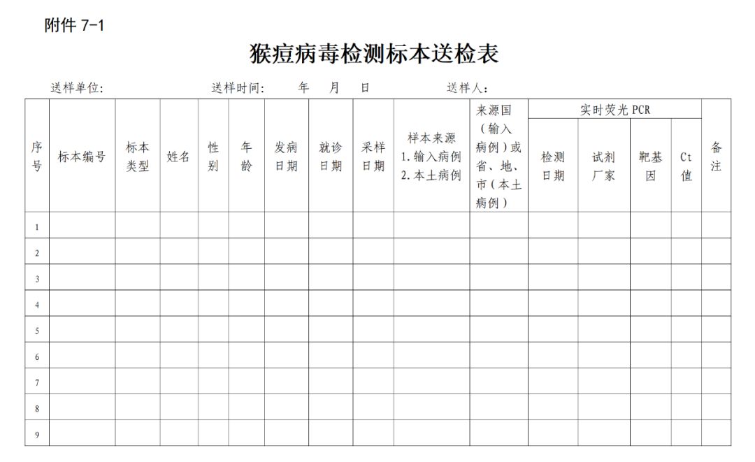1.送檢標本:病例標本先由省級及以下疾控機構進行初步檢測,各省首例猴痘陽性標本應送中國疾控中心病毒病所復核。每個陽性病例至少采集一套標本(皮膚或黏膜病變部位標本、口咽拭子標本及急性期、恢復期雙份血清標本)送中國疾控中心病毒病所檢測。各省級疾控機構根據實際情況制定省內樣本送檢、復核流程。