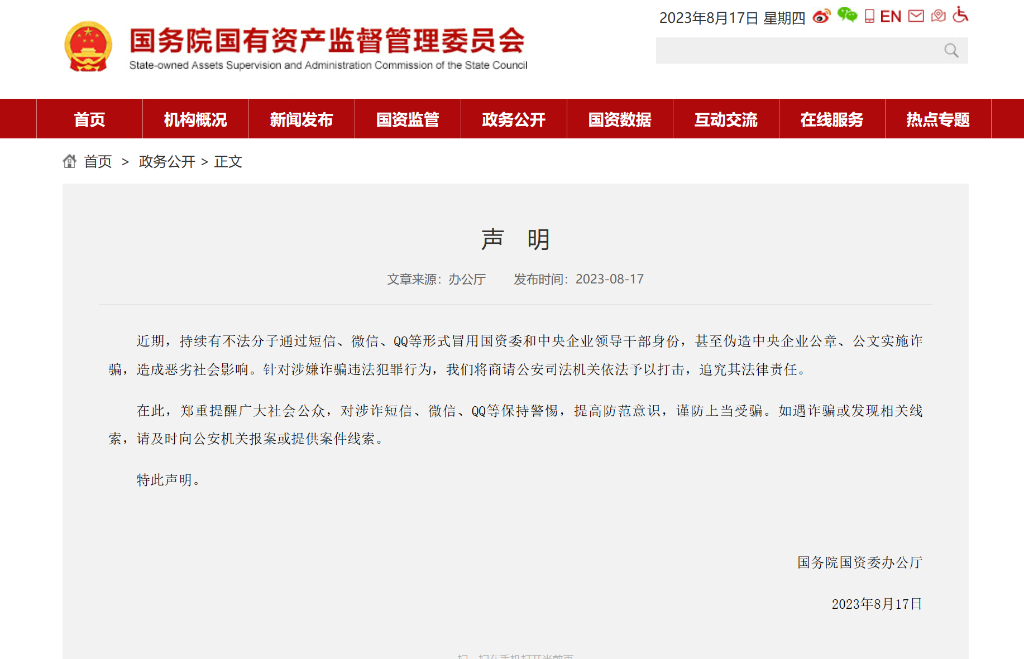國務院國資委辦公廳8月17日在國務院國資委官網(wǎng)發(fā)布聲明稱,近期,持續(xù)有不法分子通過短信、微信、QQ等形式冒用國務院國資委和中央企業(yè)領導干部身份,甚至偽造中央企業(yè)公章、公文實施詐騙,造成惡劣社會影響。針對涉嫌詐騙違法犯罪行為,國務院國資委將商請公安司法機關依法予以打擊,追究其法律責任。