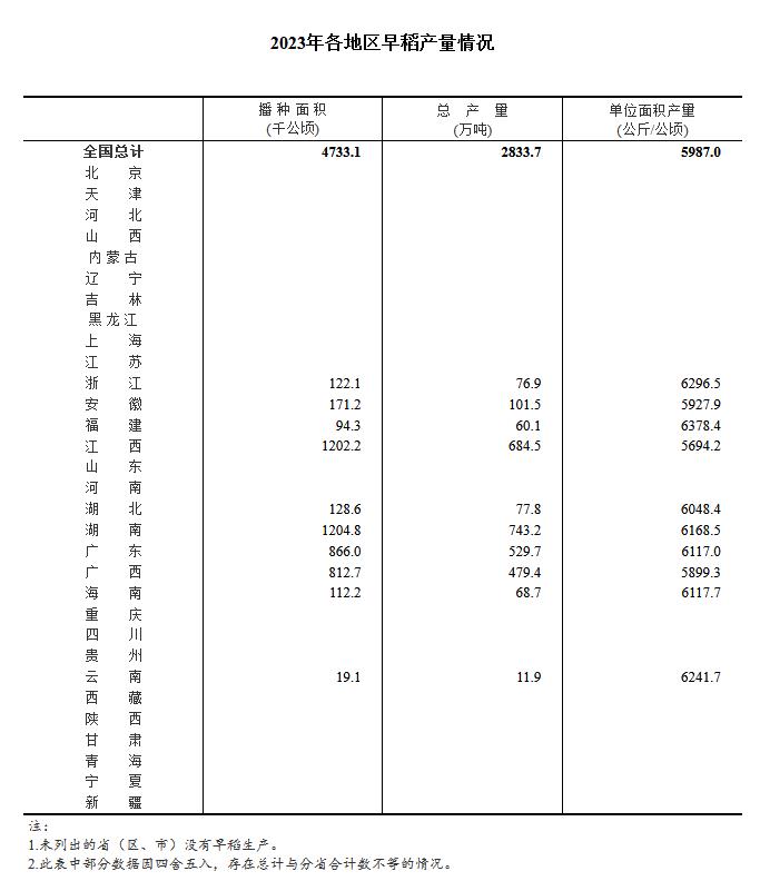 中新網(wǎng)8月23日電 國家統(tǒng)計局網(wǎng)站23日發(fā)布關于2023年早稻產(chǎn)量數(shù)據(jù)的公告。根據(jù)早稻抽樣調(diào)查結(jié)果推算,2023年全國早稻播種面積、單位面積產(chǎn)量、總產(chǎn)量如下: