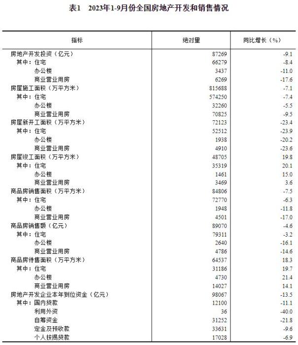 國(guó)家統(tǒng)計(jì)局:1-9月份商品房銷(xiāo)售面積同比下降7.5%
