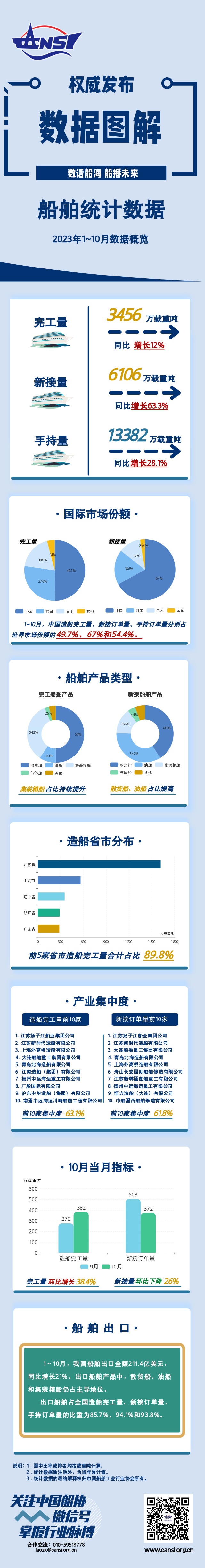 1-10月,我國船舶出口金額211.4億美元,同比增長21%。出口船舶產(chǎn)品中,散貨船、油船和集裝箱船仍占主導(dǎo)地位。出口船舶占全國造船完工量、新接訂單量、手持訂單量的比重為85.7%、94.1%和93.8%。