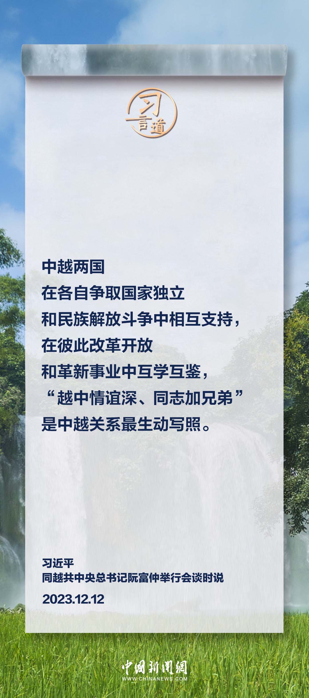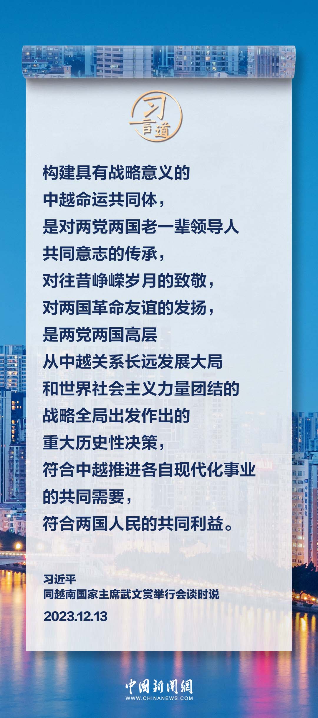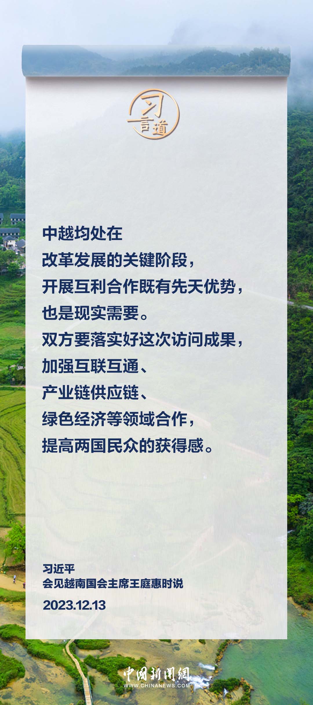應越南共產黨中央委員會總書記阮富仲、越南社會主義共和國主席武文賞邀請,中共中央總書記、國家主席習近平于12月12日至13日對越南進行國事訪問。訪問期間,習近平指出——