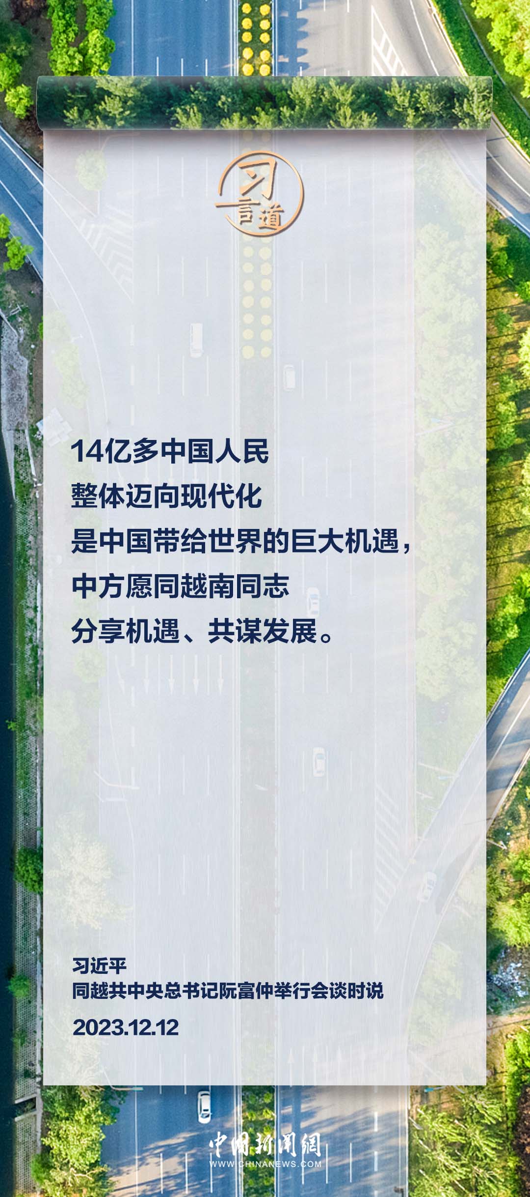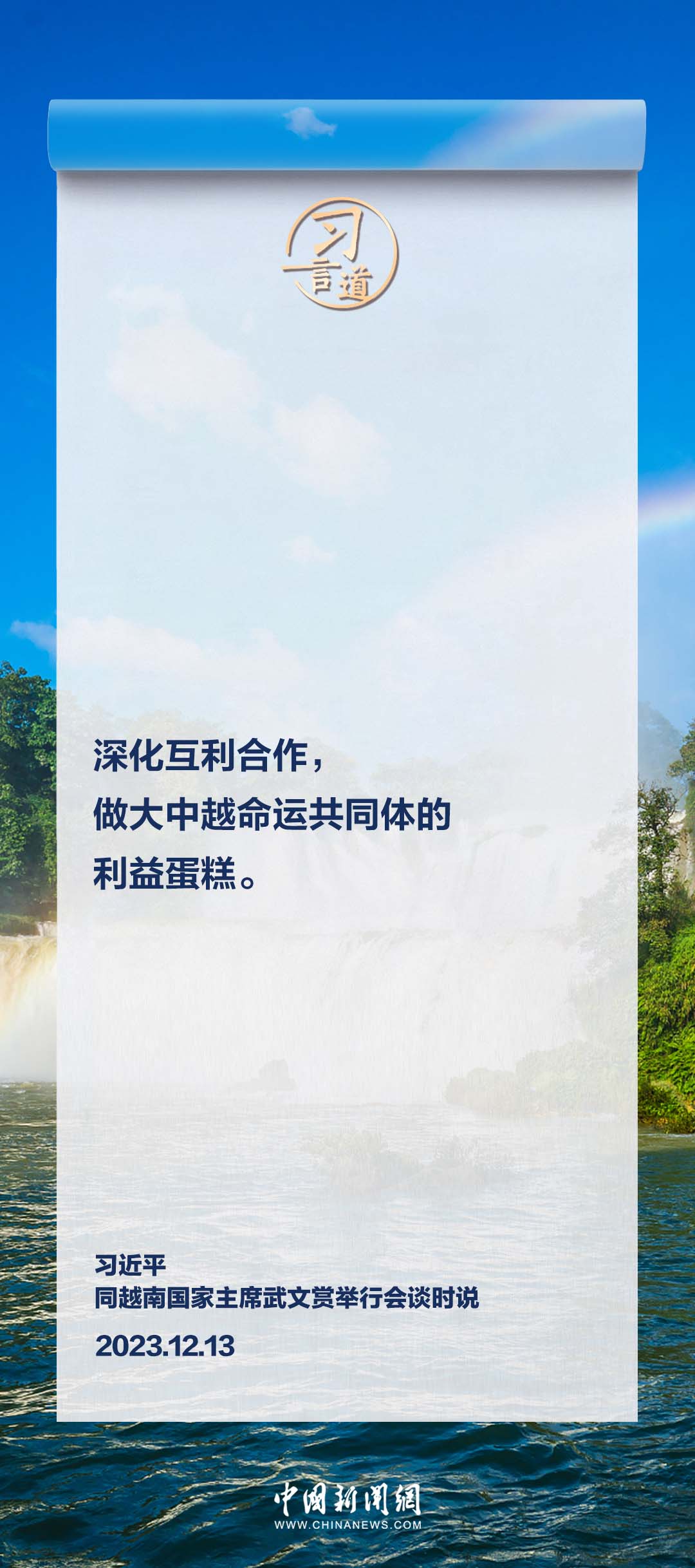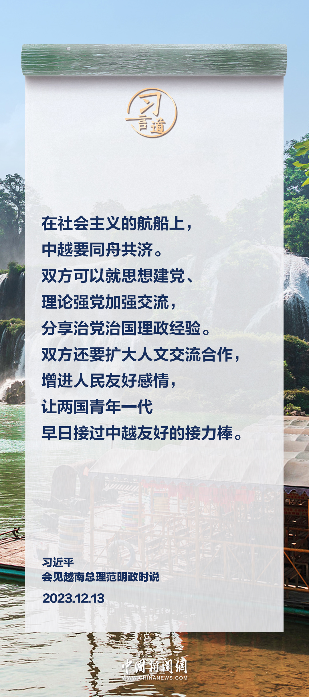 應越南共產黨中央委員會總書記阮富仲、越南社會主義共和國主席武文賞邀請,中共中央總書記、國家主席習近平于12月12日至13日對越南進行國事訪問。訪問期間,習近平指出——