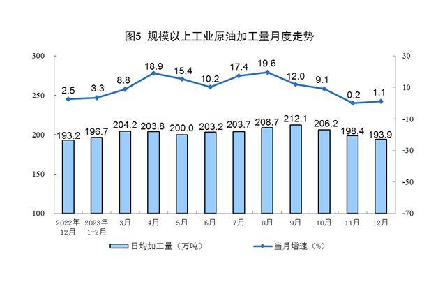 原油生產(chǎn)有所加快,進(jìn)口由降轉(zhuǎn)升。12月份,規(guī)上工業(yè)原油產(chǎn)量1765萬噸,同比增長4.6%,增速比11月份加快2.0個(gè)百分點(diǎn),日均產(chǎn)量56.9萬噸。進(jìn)口原油4836萬噸,同比增長0.6%,11月份為下降9.1%。