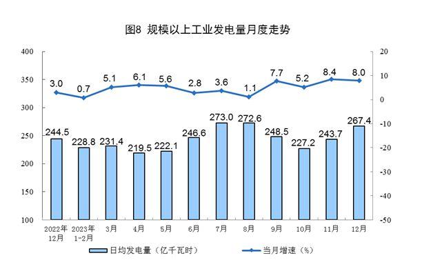 電力生產(chǎn)平穩(wěn)。12月份,規(guī)上工業(yè)發(fā)電量8290億千瓦時(shí),同比增長8.0%,增速比11月份放緩0.4個(gè)百分點(diǎn),日均發(fā)電267.4億千瓦時(shí)。2023年,規(guī)上工業(yè)發(fā)電量8.9萬億千瓦時(shí),同比增長5.2%。