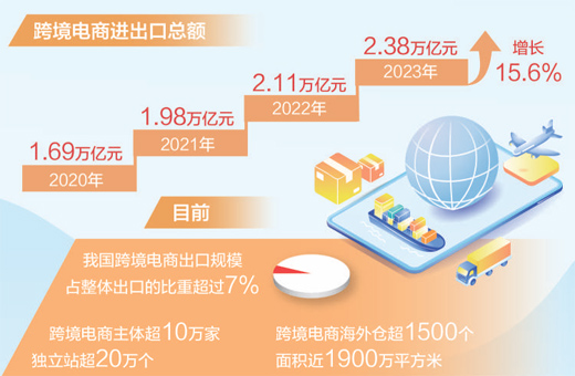 據(jù)海關(guān)測(cè)算,2023年,我國(guó)跨境電商進(jìn)出口總額2.38萬億元,增長(zhǎng)15.6%。其中,出口1.83萬億元,增長(zhǎng)19.6%;進(jìn)口5483億元,增長(zhǎng)3.9%??缇畴娚炭焖侔l(fā)展,既滿足了國(guó)內(nèi)消費(fèi)者多樣化個(gè)性化需求,又助力我國(guó)產(chǎn)品通達(dá)全球,成為外貿(mào)發(fā)展的重要?jiǎng)幽堋?/p>