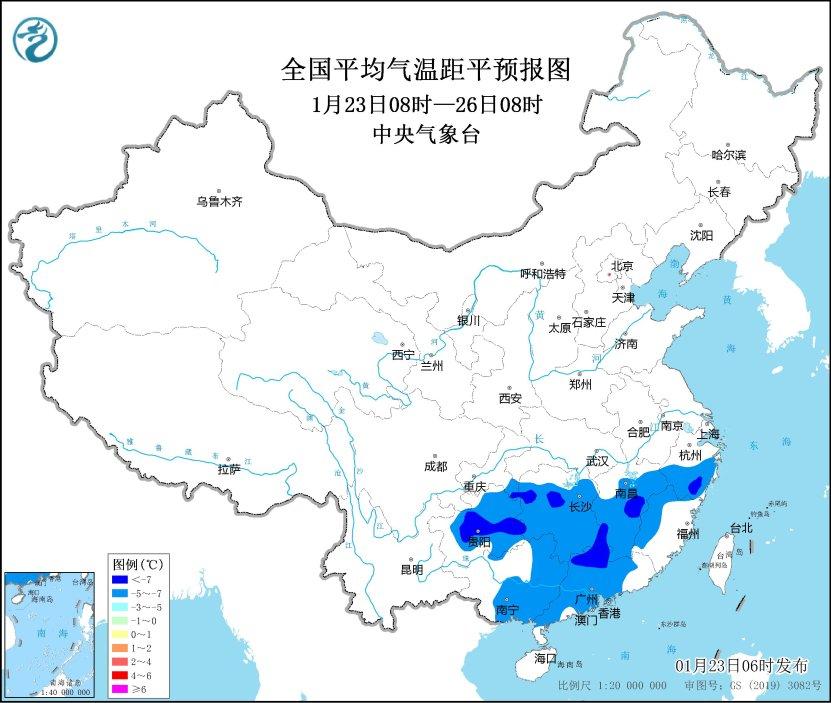 預(yù)計,1月23日至25日,貴州、湖南、江西、浙江中南部、福建西部、廣東、廣西中東部等地最低氣溫或平均氣溫較歷史同期偏低5℃以上,其中,貴州中東部、湖南西北部、江西中南部、浙江南部、廣東西北部等地的部分地區(qū)偏低7℃以上,最低氣溫0℃線將位于廣西北部、廣東北部一帶。中央氣象臺1月23日06時繼續(xù)發(fā)布低溫藍(lán)色預(yù)警。