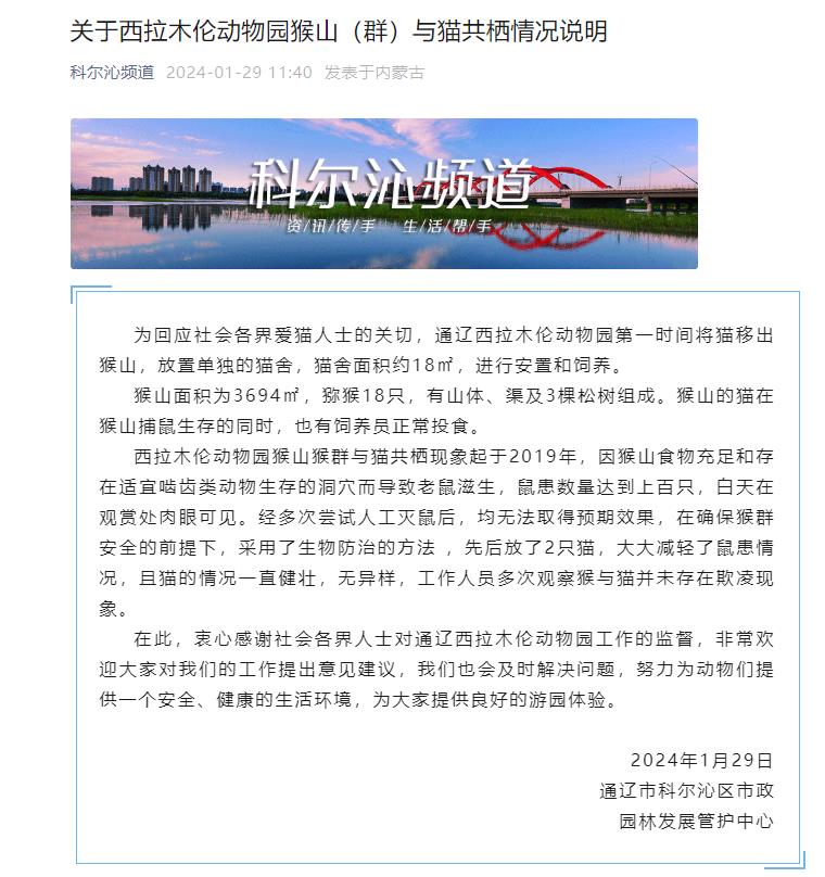中新網(wǎng)1月29日電 據(jù)內(nèi)蒙古通遼市科爾沁區(qū)融媒體中心微信公眾號消息,通遼市科爾沁區(qū)市政園林發(fā)展管護(hù)中心29日發(fā)布《關(guān)于西拉木倫動物園猴山(群)與貓共棲情況說明》(下稱“情況說明”)。情況說明顯示,通遼西拉木倫動物園已第一時間將貓移出猴山,且貓的情況一直健壯,無異樣,工作人員多次觀察猴與貓并未存在欺凌現(xiàn)象。全文如下: