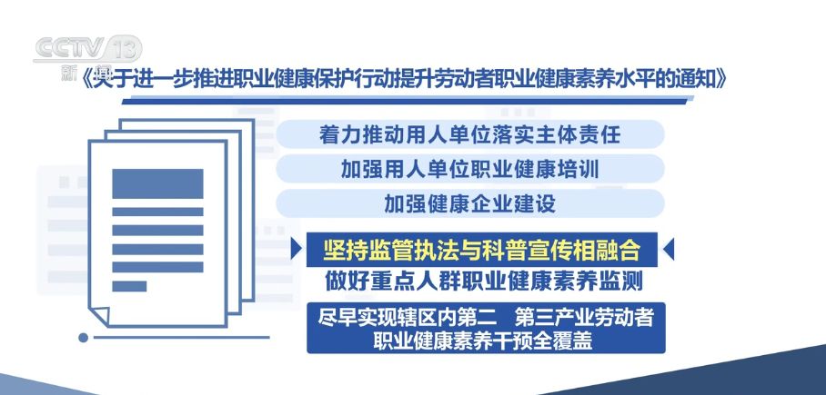 央視網(wǎng)消息:國家衛(wèi)生健康委、國家疾控局、教育部等八部門近日聯(lián)合印發(fā)《關(guān)于進一步推進職業(yè)健康保護行動提升勞動者職業(yè)健康素養(yǎng)水平的通知》?!锻ㄖ访鞔_,進一步加強職業(yè)健康管理,加大重點人群職業(yè)健康素養(yǎng)干預(yù)力度,到2030年,力爭實現(xiàn)重點行業(yè)勞動者對本崗位主要危害及防護知識知曉率不低于90%。