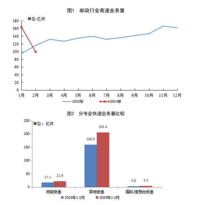 1-2月,同城快遞業(yè)務(wù)量完成21.9億件,同比增長28.3%;異地快遞業(yè)務(wù)量完成205.4億件,同比增長28.5%;國際/港澳臺快遞業(yè)務(wù)量完成5.3億件,同比增長31.9%。