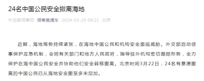 中新網(wǎng)3月25日電 據(jù)外交部領(lǐng)事司微信公眾號(hào)“領(lǐng)事直通車(chē)”25日消息,近期,海地局勢(shì)持續(xù)緊張,在海地中國(guó)公民和機(jī)構(gòu)安全面臨威脅。外交部啟動(dòng)領(lǐng)事保護(hù)應(yīng)急機(jī)制,會(huì)同有關(guān)部門(mén)和地方人民政府,指導(dǎo)駐外機(jī)構(gòu)密切跟蹤形勢(shì),全力保護(hù)在海中國(guó)公民安全并協(xié)助他們安全轉(zhuǎn)移撤離。北京時(shí)間3月22日,24名有意愿撤離的中國(guó)公民已從海地安全撤至多米尼加。
