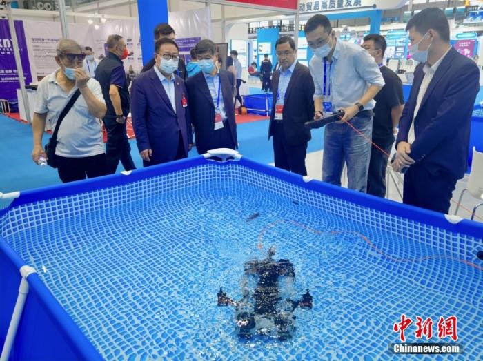 資料圖:2022年11月16日,在深圳舉行的第二十四屆中國國際高新技術(shù)成果交易會(huì)上,參展商攜“黑科技”產(chǎn)品亮相高交會(huì)。圖為深圳企業(yè)研制的潛鮫P200 PRO行業(yè)級(jí)水下機(jī)器人。 中新社記者 陳文 攝