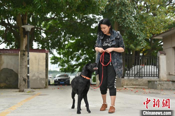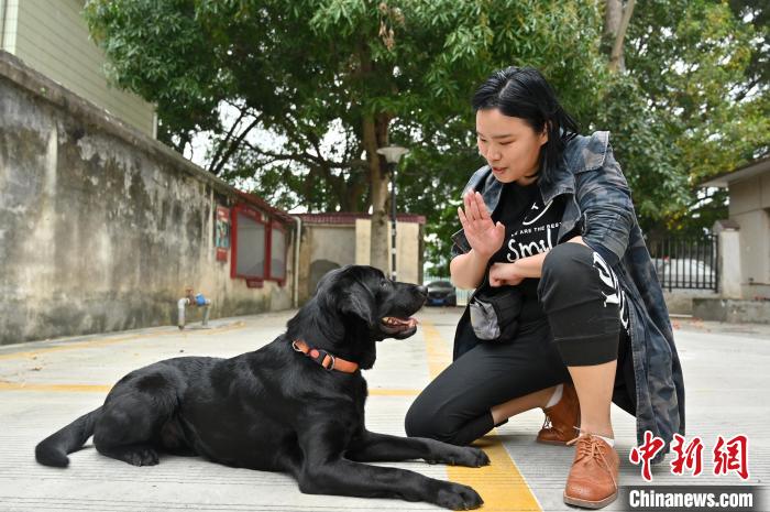 崔靜宜訓(xùn)練寵物犬趴下。 俞靖 攝